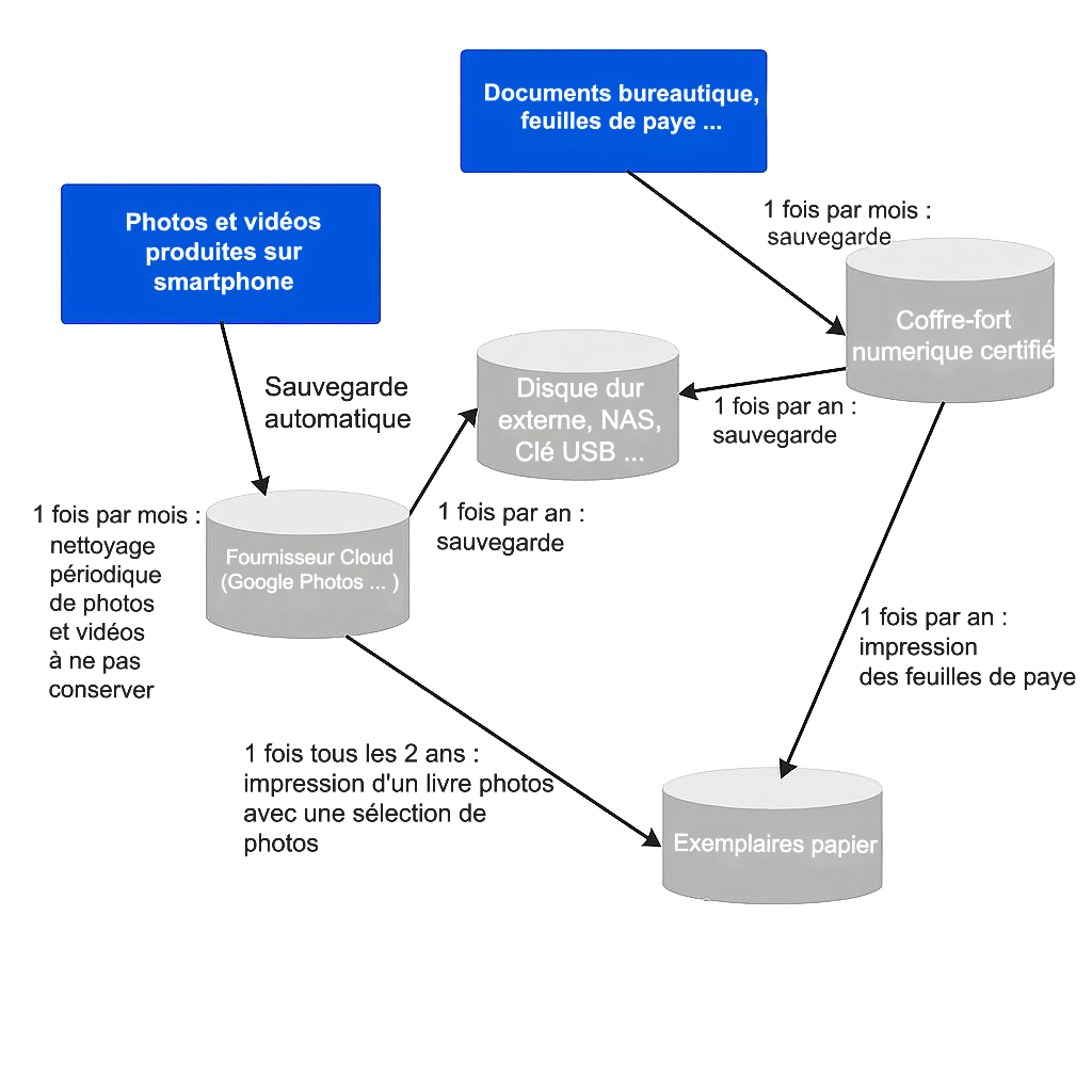Pour finir cette série d’articles, on peut évoquer l’intérêt d’élaborer une stratégie de sauvegarde de ses documents, même rudimentaire, et de la mettre en œuvre avec rigueur (en consignant dans un tableau, par exemple, les dates de sauvegarde…). Nous nous sommes prêtés au jeu et vous proposons ici un exemple que nous suivons à titre personnel. A vous d’adapter cette stratégie à vos propres besoins et préférences !